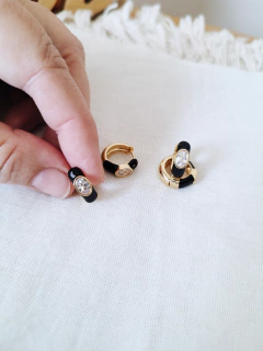 Hermosas Argollitas de brass, bañadas en oro 18k y esmaltadas en negro con un cubics central. Libres cadmio y plomo.