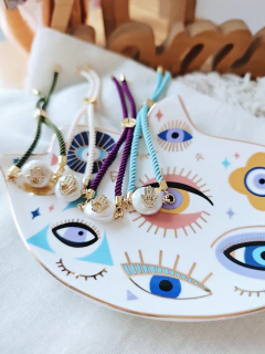 Hermosa pulsera con dije conector de perla y manito de hamsa bañada en oro y cubics, el cordón de algodon es regulable y Mide 19.5cm total